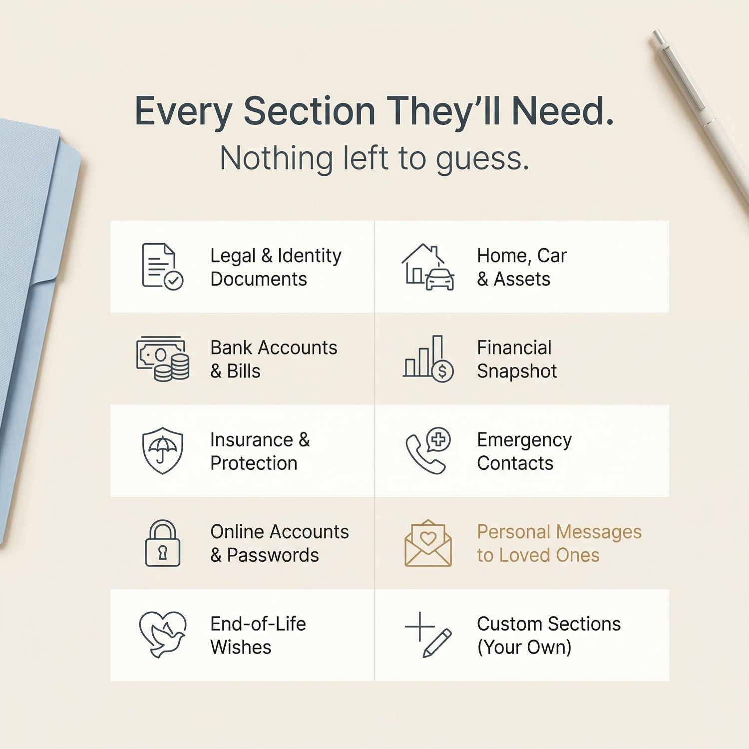The Final Chapter Folder solves it by giving you every section your family would actually need. From bank accounts and passwords to funeral wishes and personal letters. Nothing is left for you to research or figure out.
