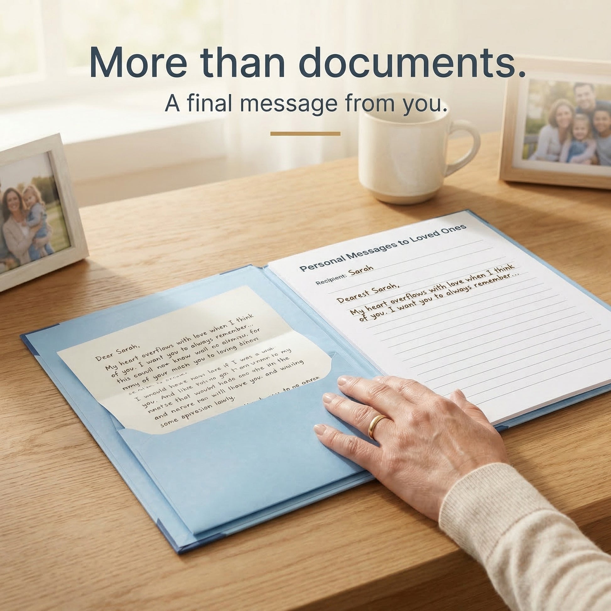 The Final Chapter Folder holds everything in one physical place. Accounts, insurance, passwords, documents, wishes, and personal messages. Organized, labeled, and ready to use the moment it matters.