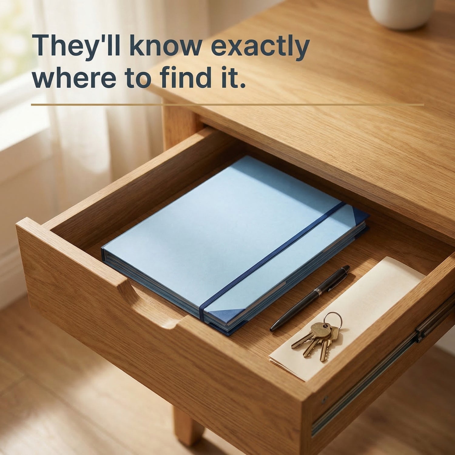 Put it in a drawer, on a shelf, or in a safe. Tell one person where it is. That single conversation is the difference between weeks of chaos and a family that knows exactly what to do.