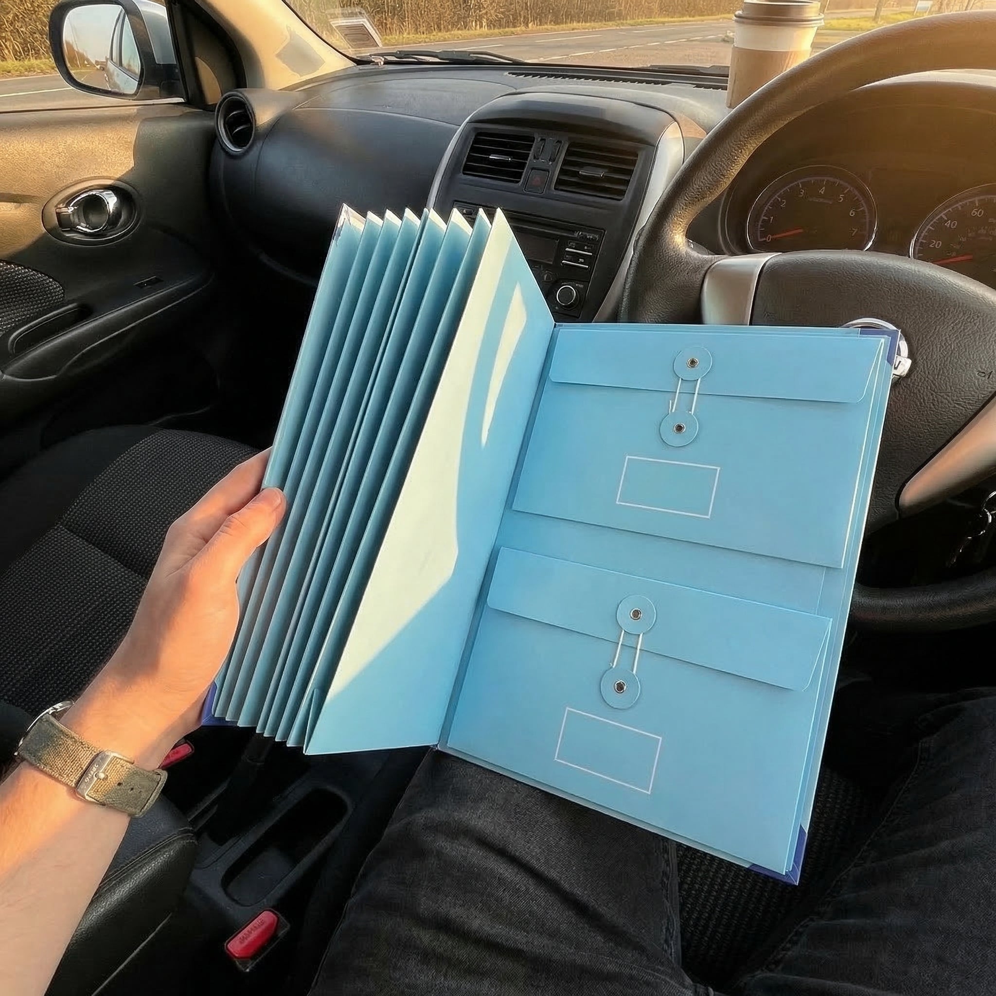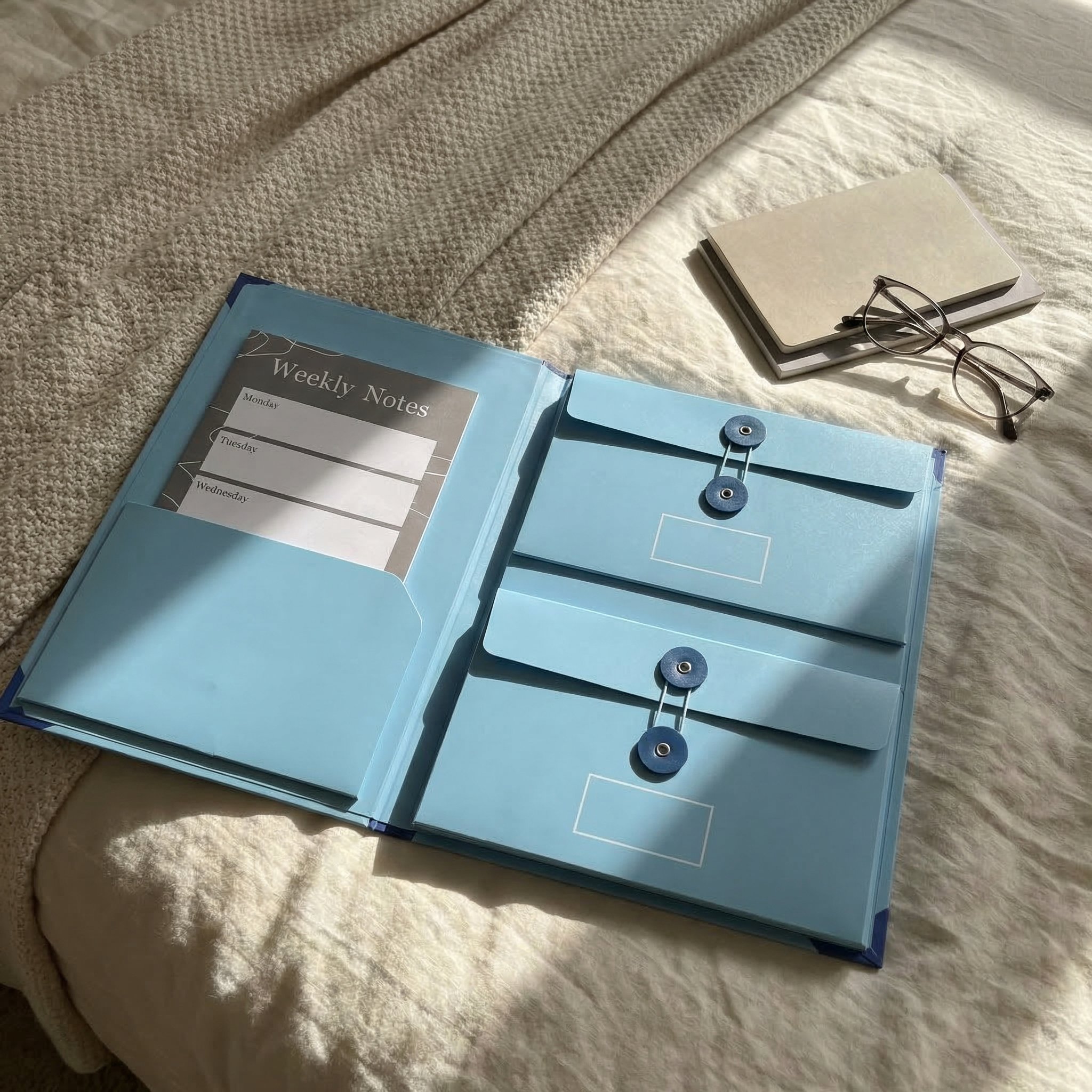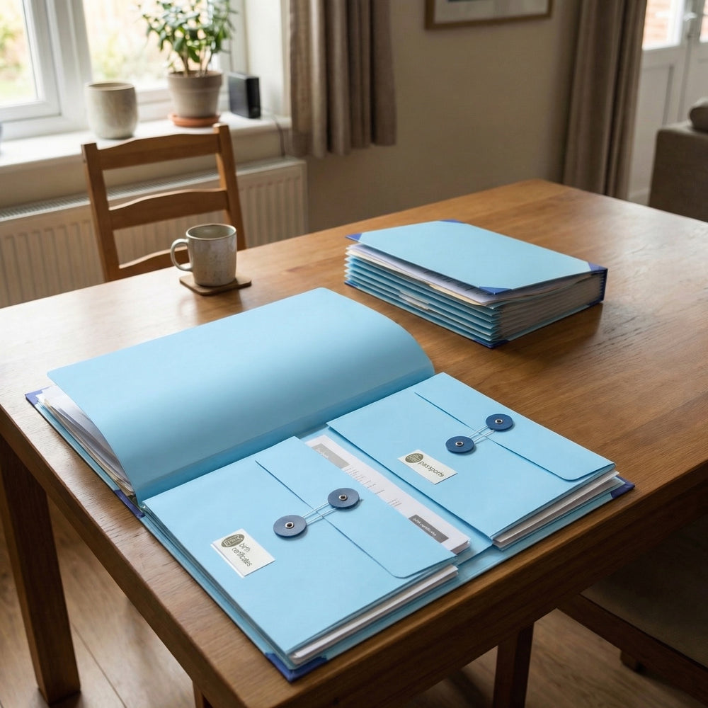 Plus: table of contents, pre-labeled tab dividers, envelope pouches for physical documents, labeled stickers, and a pen loop. Everything in one place. Ready to fill in, easy to find, impossible to lose.